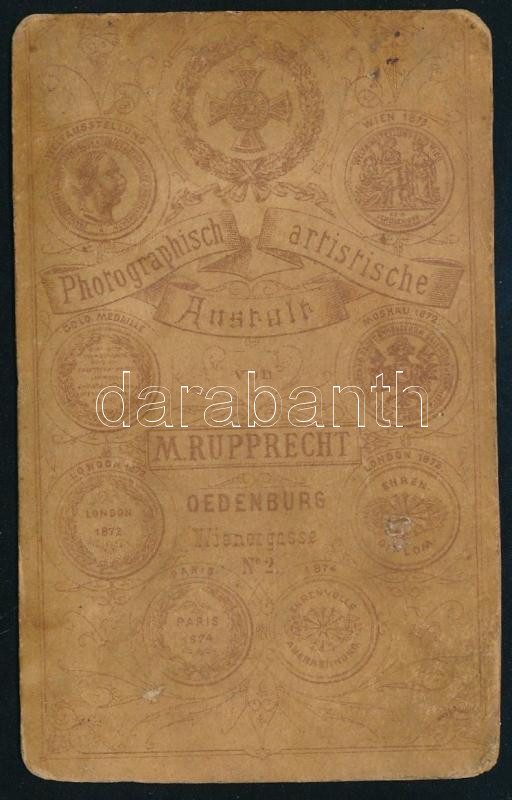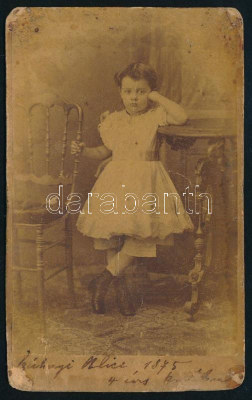 1875 sárvár-felsővidéki gróf Széchényi Alice (1871-1945), gróf Széchenyi Béla (1837-1918) és gróf Erdődy Johanna (1846-1872) lányának portréja, vizitkártya Rupprecht Mihály soproni (Oedenburg) műterméből, feliratozva, viseltes állapotban, 9,5x6 cm