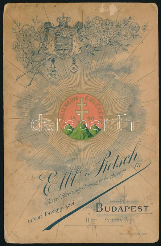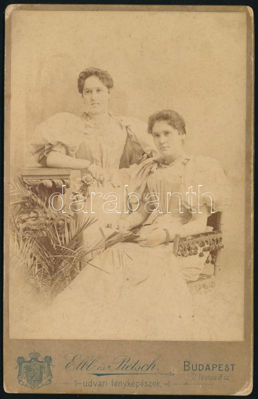 1896 Két elegáns fiatal hölgy portréja, kabinetfotó Elbl és Pietsch udvari fényképészek budapesti műterméből, díszes millenniumi verzóval, kissé viseltes, 16,5x10,5 cm