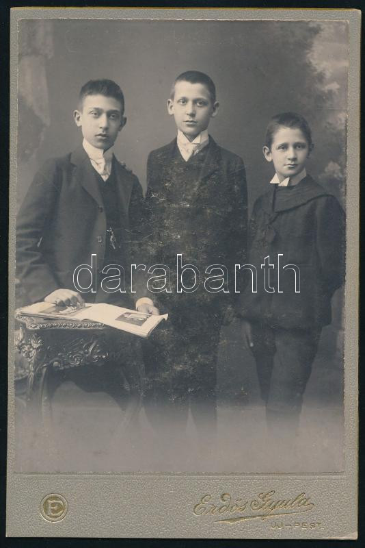 1910 Három fiatal fiú portréja, kabinetfotó Erdős Gyula újpesti műterméből, kissé kopott, 16,5x11 cm