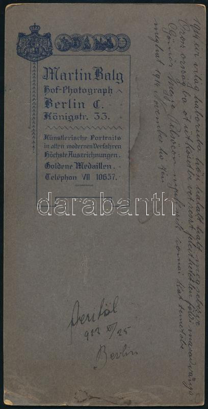 1912 Berlin, fiatal (magyar) férfi portréja, a hátoldalon található, korabeli felirat szerint 1914 novemberében az I. világháborúban hősi halált halt Oroszországban, ezt követően a Gömör megyei Pelsőcön temették el; kabinetfotó Marin Balg berlini műterméből, 21x10,5 cm