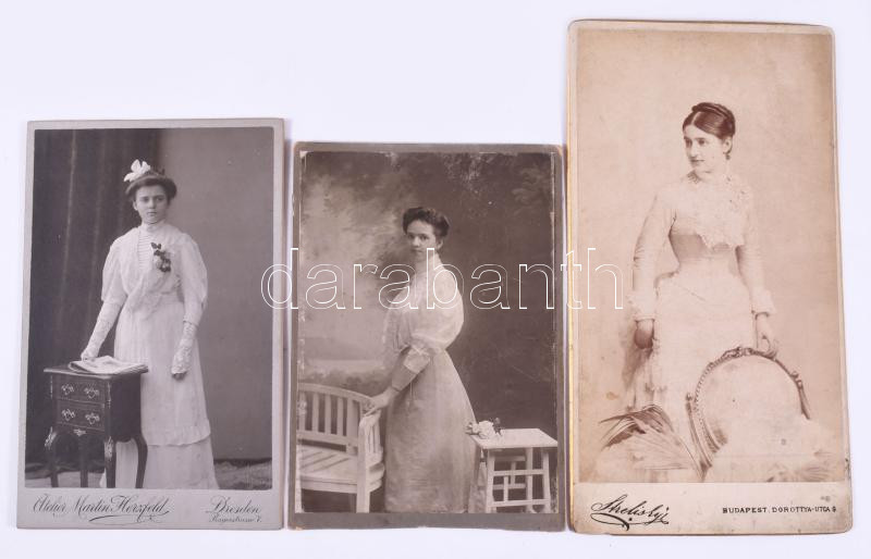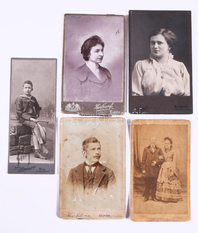 76 db vegyes keményhátú fotó (vizitkártya, kabinetfotó), különféle műtermekből, változó méretben és állapotban