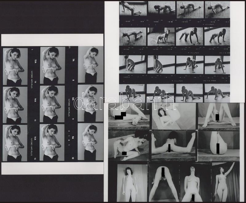 Eltérő időben készült aktfotók kontaktlapjai, szolidan erotikus felvételek, 3 db modern nagyítás, jelzés nélkül, 21x15 cm és 15x21 cm