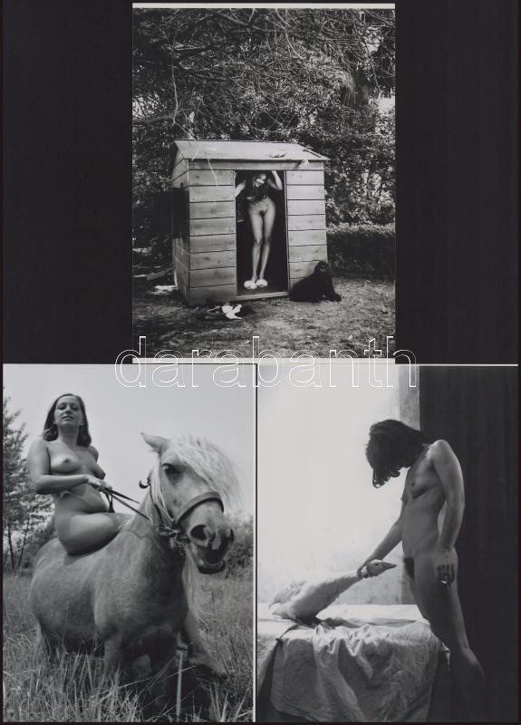 Eltérő időben készült aktfotók lóval, kutyával, libával, szolidan erotikus felvételek, 3 db modern nagyítás, jelzés nélkül, 21x15 cm