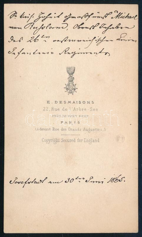 Mihail Nyikolajevics Romanov orosz nagyherceg, orosz tábornagy (Grand Duke Mikhail Nikolaevich of Russia, 1832-1909) keményhátú fotója, Paris, E. Desmaisons, keményhátú fotó, a hátoldalán német nyelvű bejegyzéssel, dátumozással (1865.), 10x6 cm
