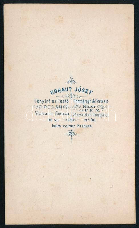 cca 1865 Szakállas úr sétapálcával, vizitkártya Kohaut József fényíró és festő budai műterméből, 10,5x6 cm