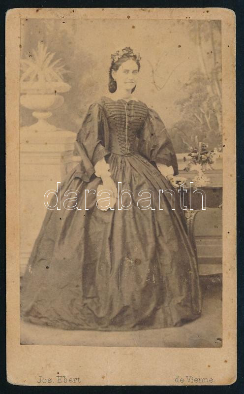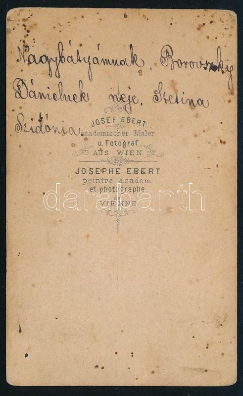 cca 1870 Hölgyportré (Borovszky Dánielné Stetina Szidónia), vizitkártya Jos. Ebert bécsi műterméből, a hátoldalon feliratozva, kissé foltos, 10,5x6,5 cm