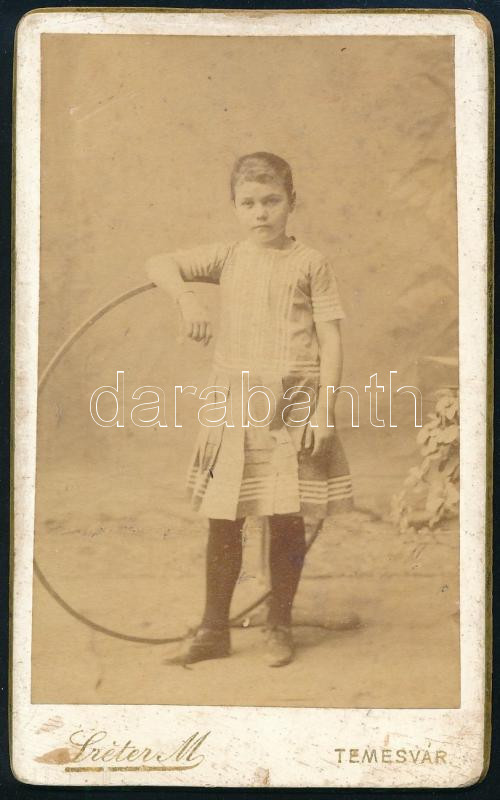 cca 1890 Fiatal lány karikával, vizitkártya Sréter M. temesvári (Timisoara) műterméből, a hátoldalon feliratozva, 10,5x6,5 cm (Ritka!)