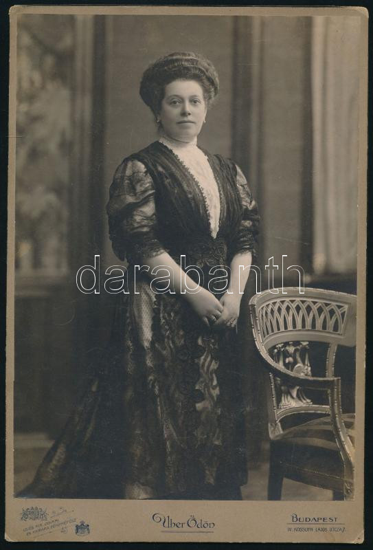 cca 1910 Elegáns hölgy portréja, nagyméretű kabinetfotó Uher Ödön budapesti műterméből, sarkain kissé sérült, 25x17 cm