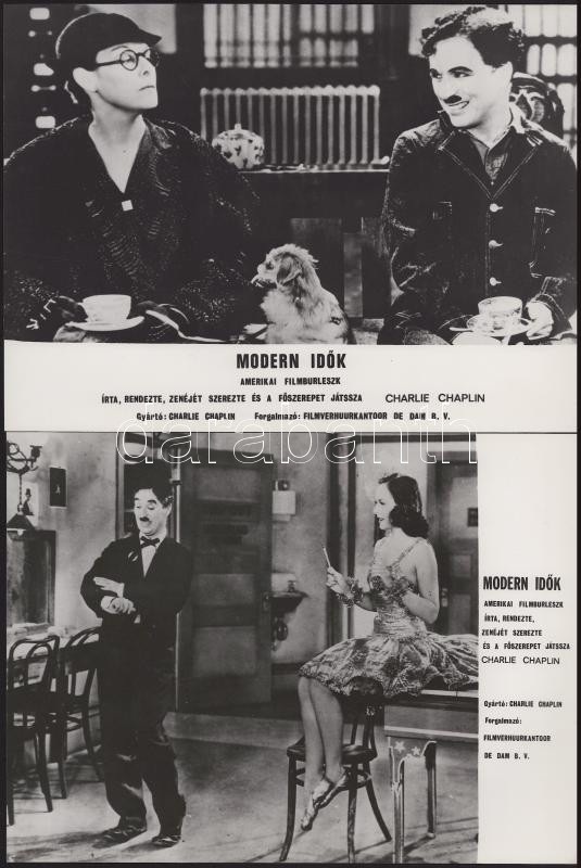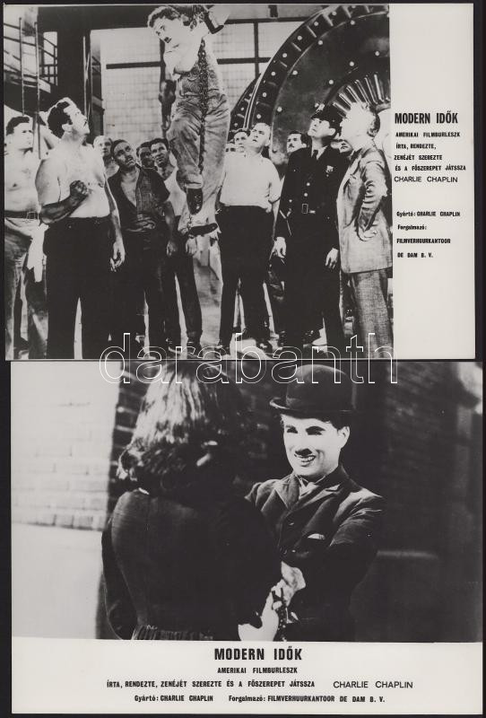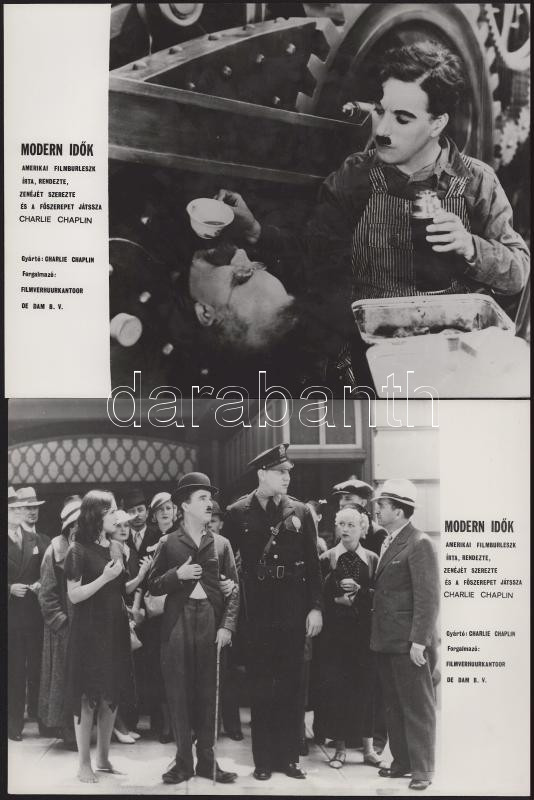 cca 1939 előtt készült, "Modern idők" című amerikai film jelenetei és szereplői (főszereplő Charlie Chaplin), 24 db vintage produkciós filmfotó (vitrinfotó, lobbyfotó) ezüst zselatinos fotópapíron, a használatból eredő (esetleges) kisebb hibákkal, 18x24 cm