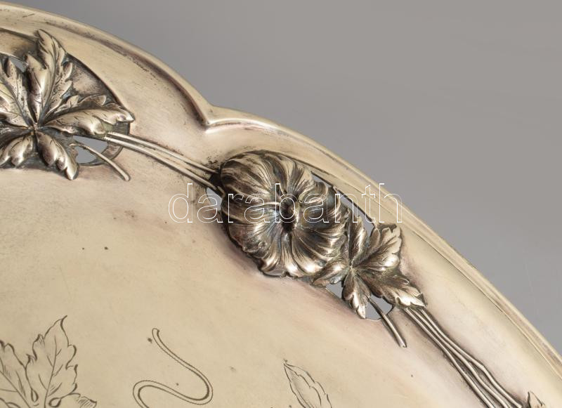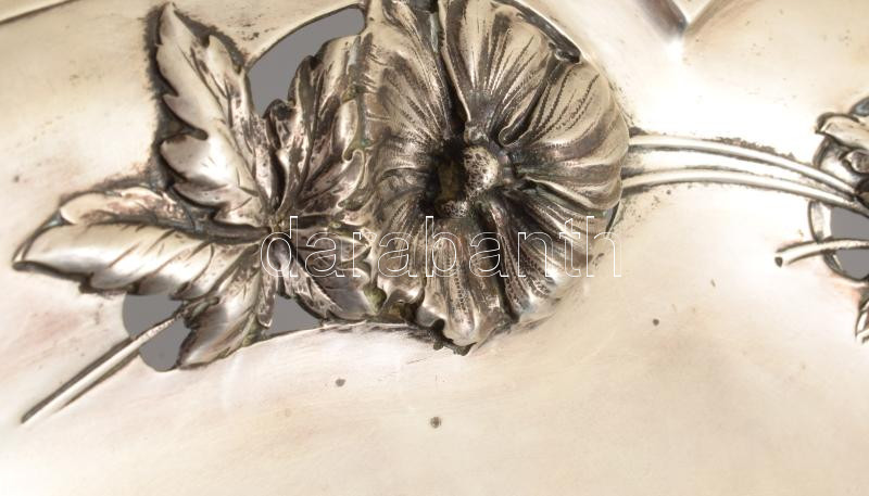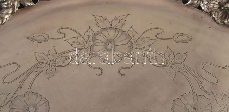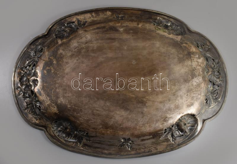 Szecessziós ezüst (Ag) szervírozótálca, áttört plasztikus virágmintával díszítve. Bécs, 1872-1922 közötti fémjel, 800 ezrelékes ezüst, FR mesterjegy, 53x39 cm, nettó 1446g