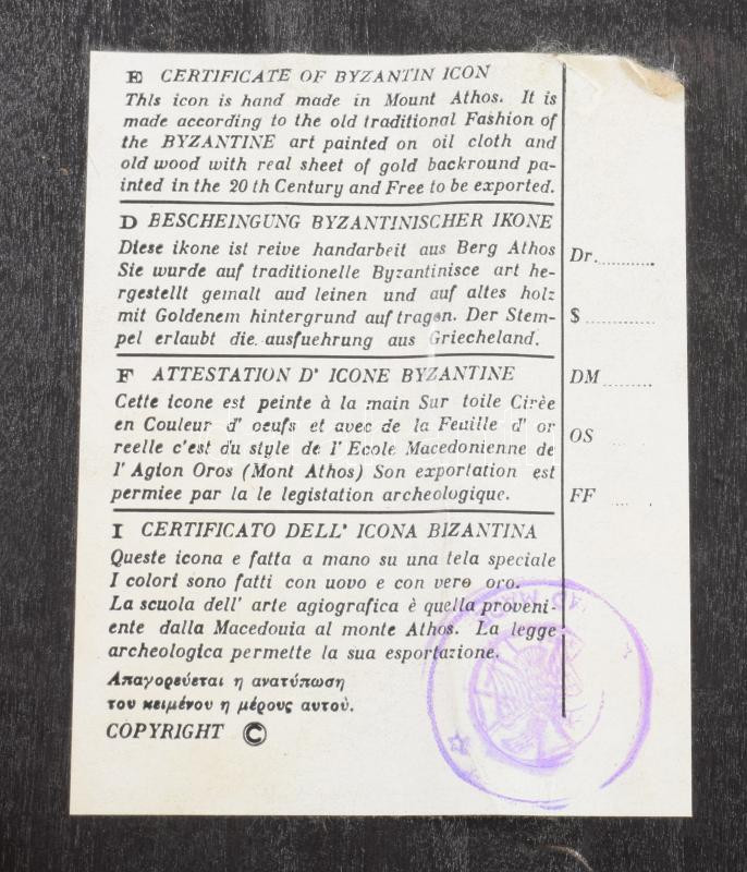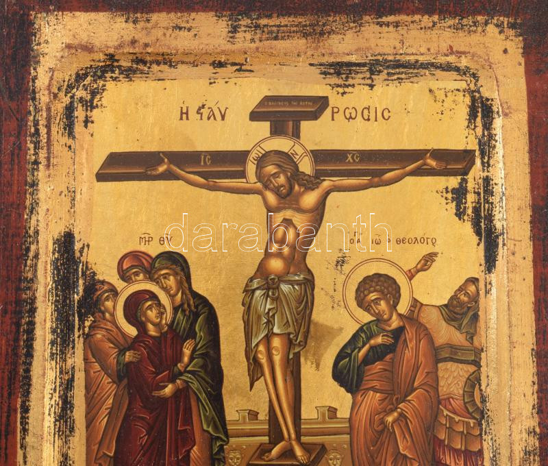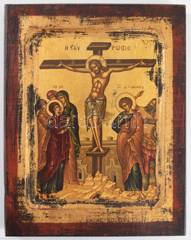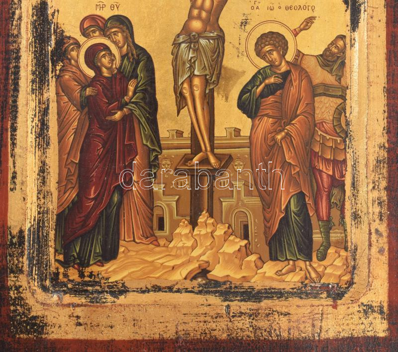 Krisztus keresztre feszítése - kézzel festett görög ikon, cca 1970, hátoldalon certifikáttal, 23x18 cm