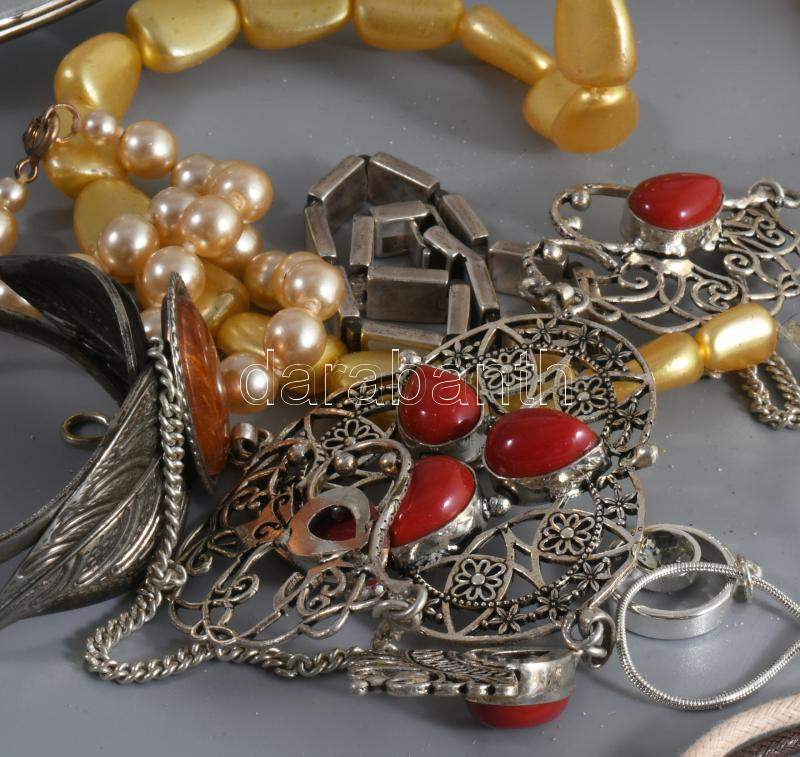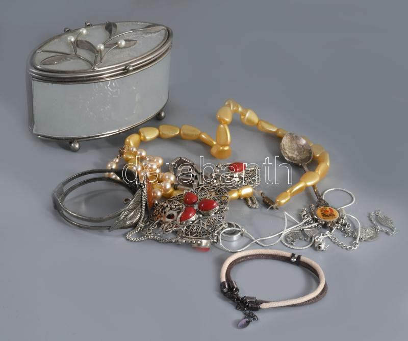 Ékszeres díszdoboz, tele bizsuval, közte ezüst (Ag) karkötő.