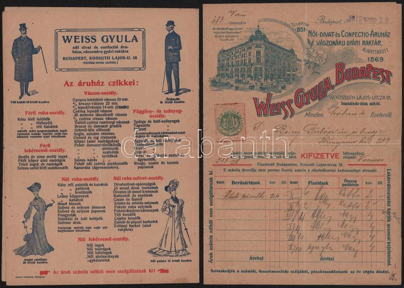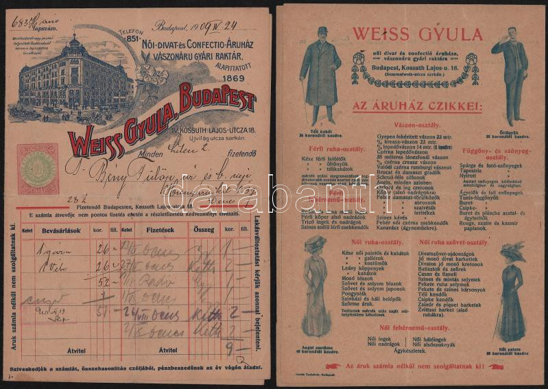 1909-1912 Bp., Weiss Gyula női-divat és confectio-áruház, vászonáru gyári raktár 2 db díjjegyes számla