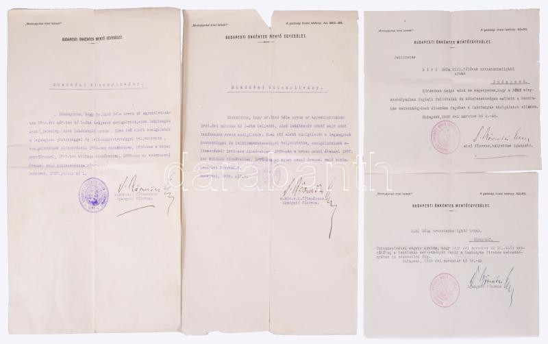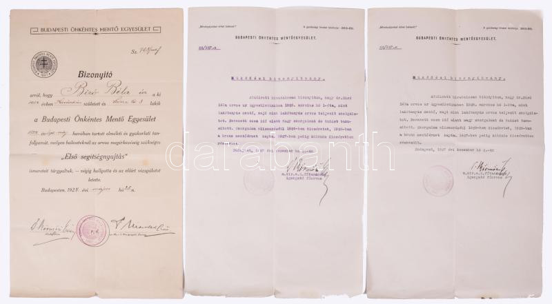 1924-1929 Budapesti Önkéntes Mentő Egyesület okiratai, 7 db, Bíró Béla orvostanhallgató, majd orvos részére, az egyiken Virosztek Győző igazgató, főorvos aláírásával, valamint azon Körmöczi Emil (1868-1949) előadó főorvos, a többin ugyan csak Körmöczi Emil igazgató főorvos belügyógyász aláírásaival, változó állapotban.