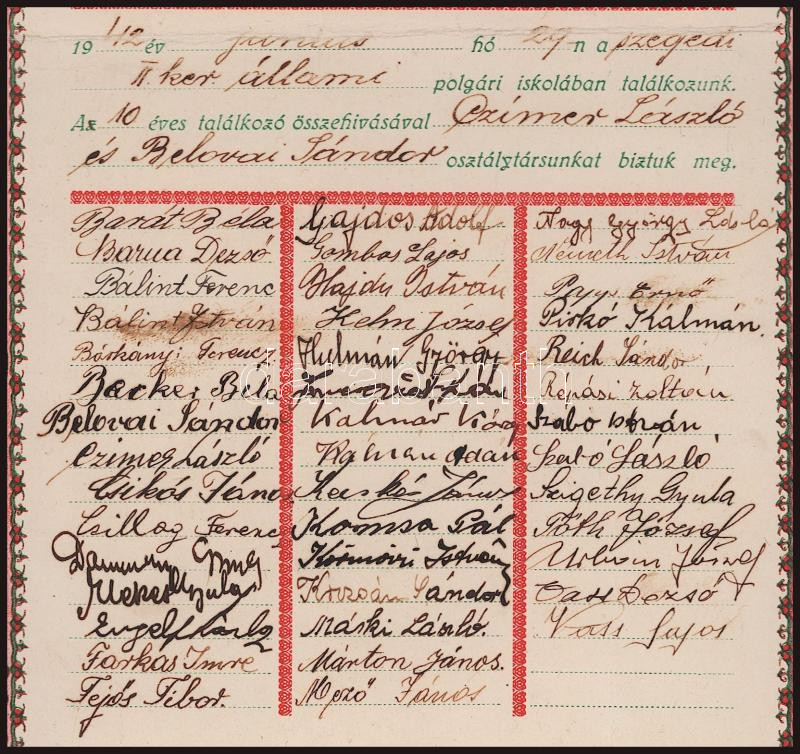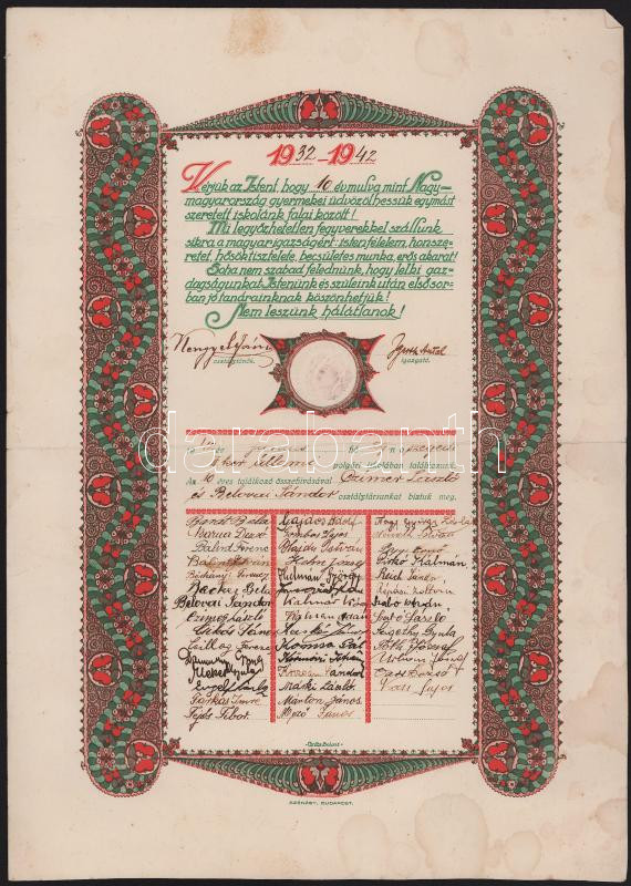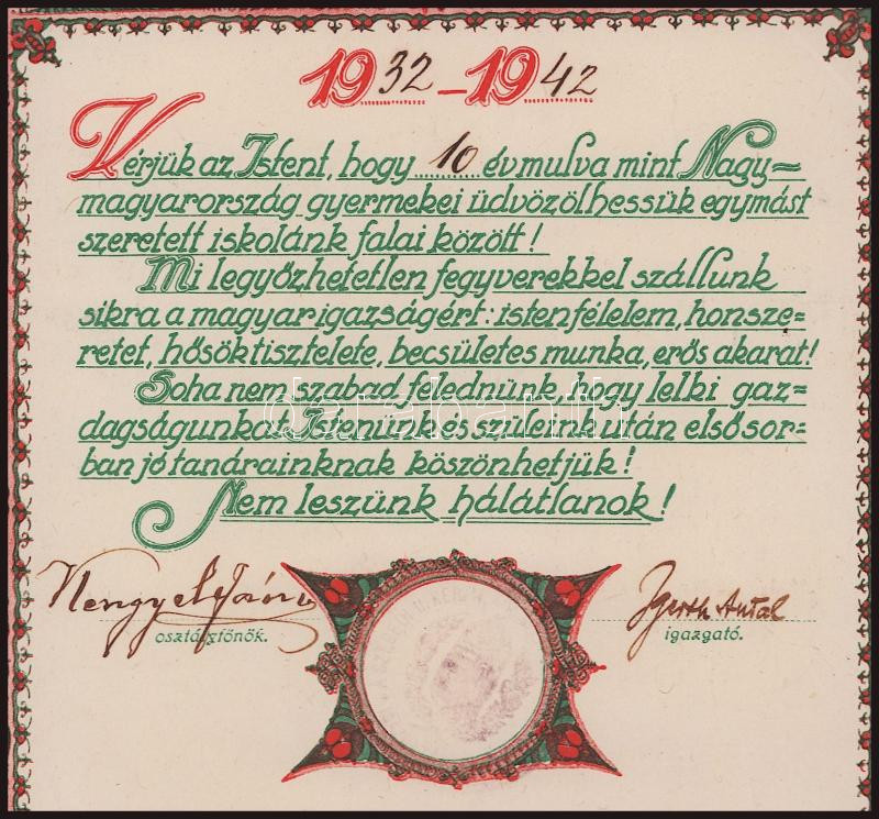 1932 Irredenta iskolai emléklap, dekoratív grafikával (szign. Csete Balázs), aláírásokkal, hajtott, foltos, 38x27 cm