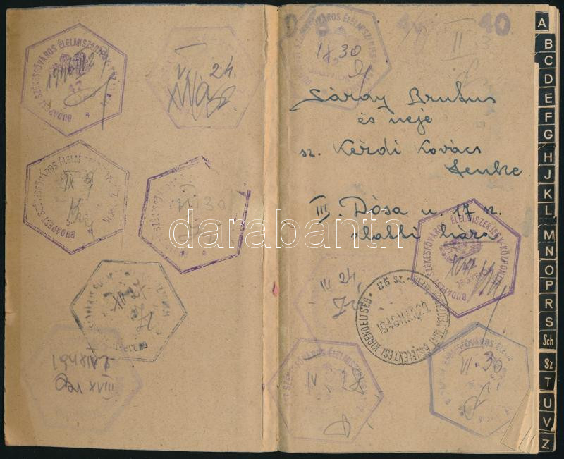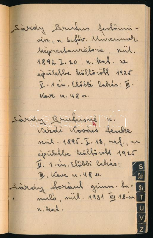 1944 Sárdy Brutus (1892-1970) festőművész, restaurátor és Sárdy Brutusné, szül. Kézdi-Kovács Lenke, autográf sorai a Bp., Dósa u. 17 (Rómaifürdő) cím alatti házuk lakókönyvében