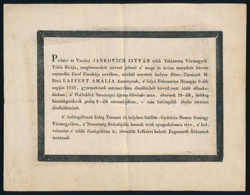 1828 Szőlősgyörök, báró Laffert Amália (1802-1828), pribéri és vuchini Jankovich István feleségének halotti értesítője, 17,5x22,5 cm