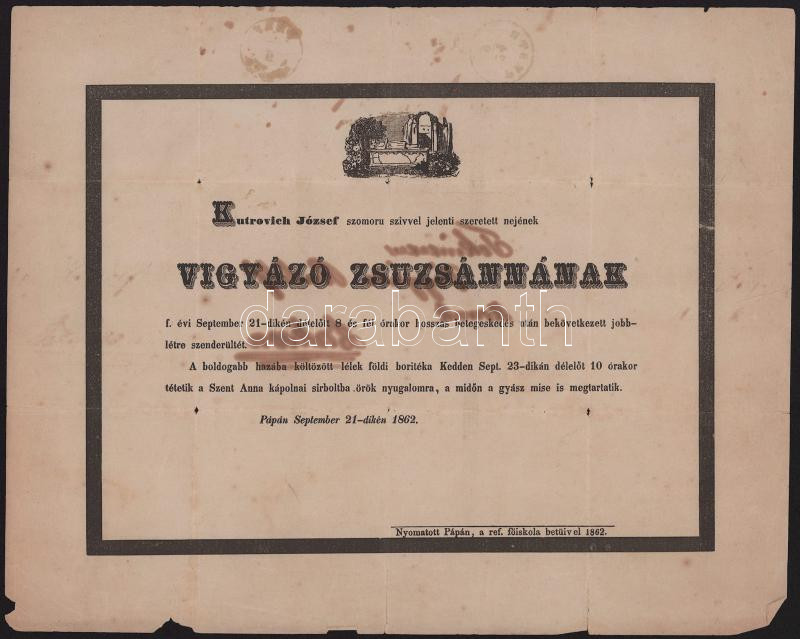 1862 Pápa, Vigyázó Zsuzsanna (1798-1862) halotti értesítője, lapszéli sérülésekkel, kissé foltos, 23x29 cm