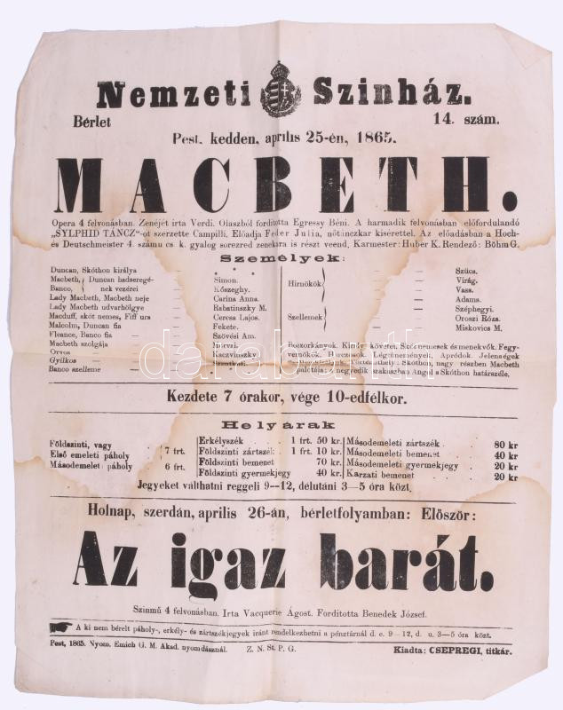 1865 Nemzeti Színház Macbeth c. előadás színházi plakát 32x38 cm Foltos