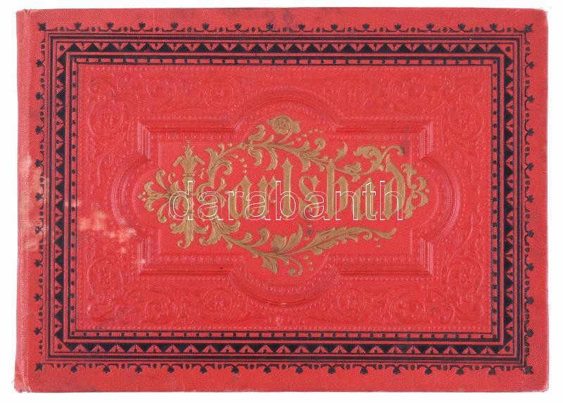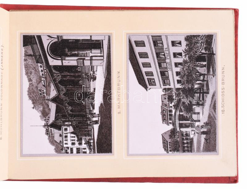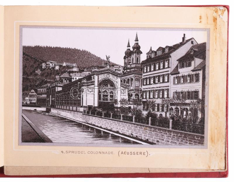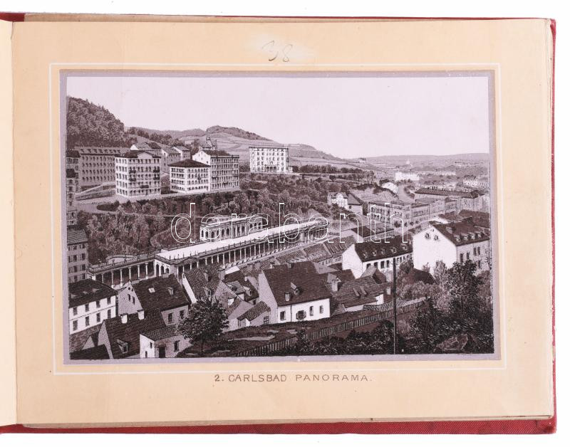 1897 Karlsbad, 47 fekete-fehér képet tartalmazó kihajtható leporello, egy lapon hajtásnyommal, kettÅ‘ lap foltos, egy helyen javÃtott, névbélyegzéssel és dátumozással. Kissé foltos, kissé kopott aranyozott, festett egészvászon-kötésben, borÃtó: 12x17 cm közötti méretben