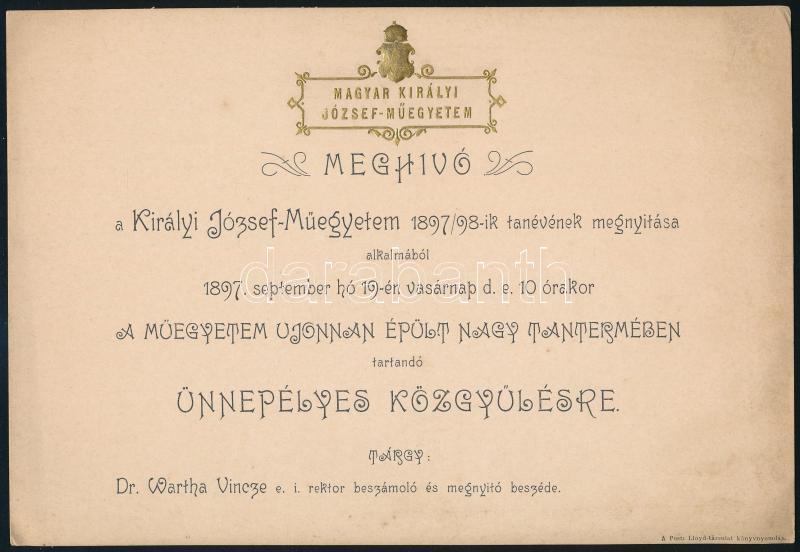 1897 Meghívó a Magyar Királyi József-Műegyetem 1897/98-ik tanévének megnyitása alkalmából. aranyozott, dombronyomott címer díszítéssel 22x15 cm