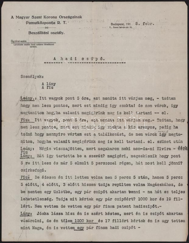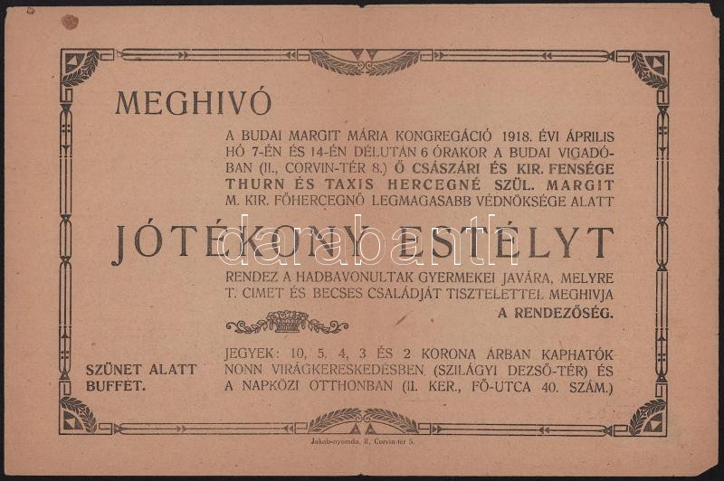 1918 Meghívó a Budai Margit Mária Kongregáció által a hadbavonultak gyermekei javára rendezett jótékonysági estélyre, műsorral + az estélyen előadott ,,A hadi cipő" című táncos előadás gépelt szövege