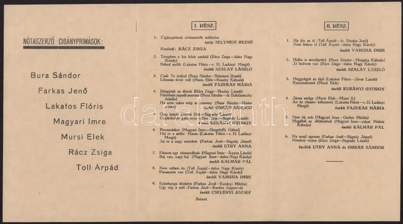 1939 Nótaszerző cigányprímások szerzői bemutatója monstre cigányzenekarral a Zeneművészeti Főiskola nagytermében, ismertető prospektus