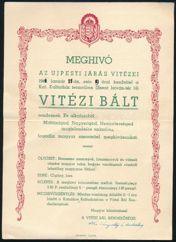 1941 Újpest, Az Újpesti Vitézi Bál Rendezősége által kiküldött báli meghívó