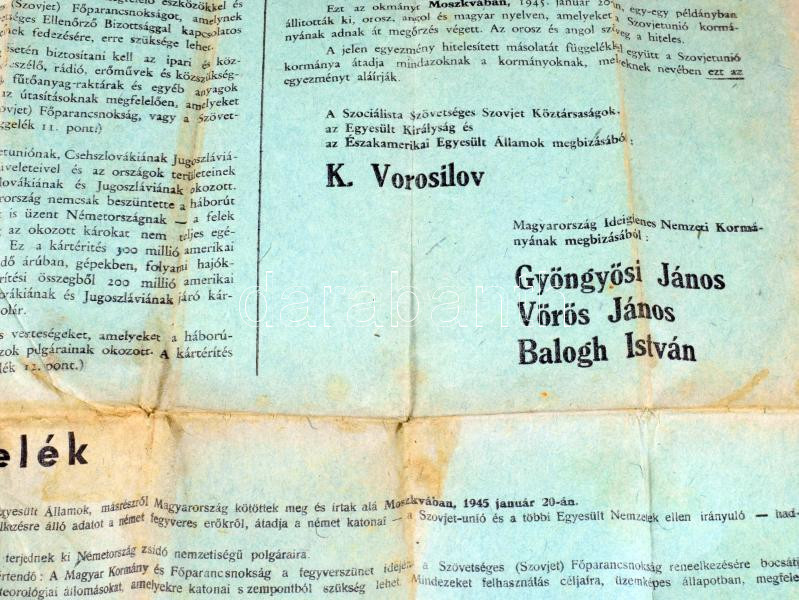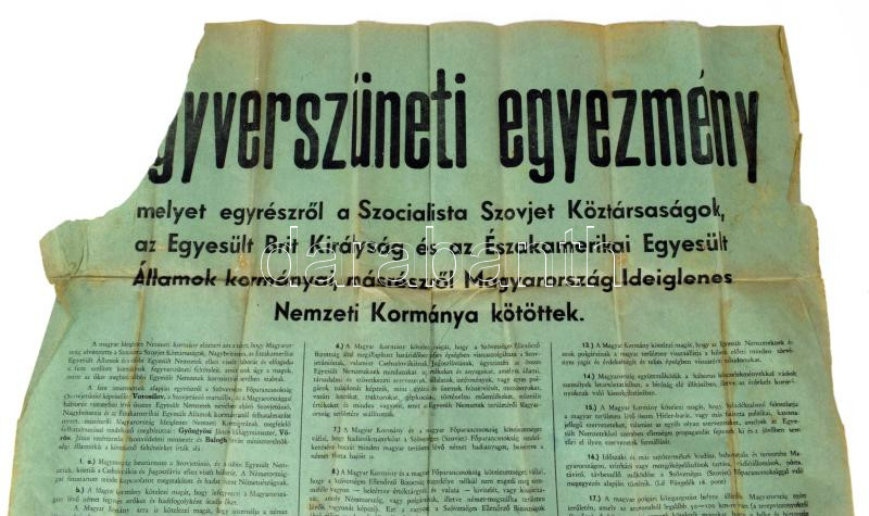 1945 Fegyverszüneti egyezmény, melyet egyrészről a Szocialista Szovjet Köztársaságok, az Egyesült Brit Királyság és az Északamerikai Egyesült Államok kormányai, másrészről Magyarország Ideiglenes Nemzeti Kormánya kötöttek. Moszkva, 1945. január 20. A II. világháborút a szövetséges hatalmak és Magyarország között lezáró fegyverszüneti egyezmény hirdetménye, sérült, hiányos (egyik sarka külön megvan), 76x53 cm