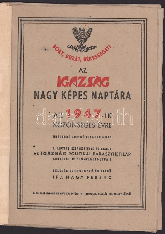 1947 Az Igazság nagy képes naptára az 1947-ik közönséges évre, szerk. és kiadja az Igazság Politikai Paraszthetilap, sérült, szétvált tűzéssel, részben pótolt borítóval