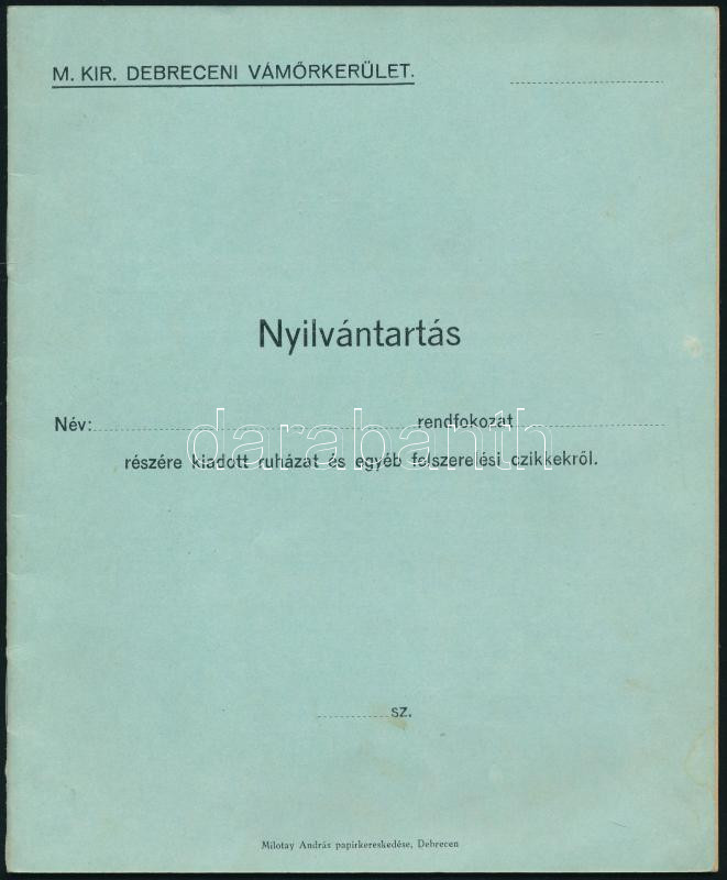 ca 1910 Debreceni Vámőrkerület nyilvántartás ruházat és egyéb felszerelési tárgyakról. Kitöltetlen 32p.