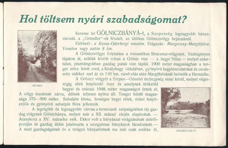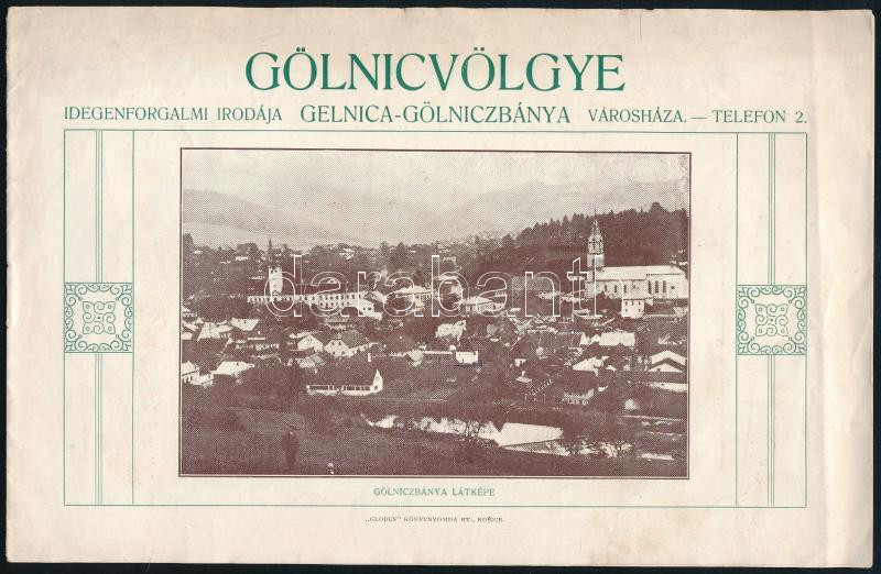 cca 1920 Gölnicvölgye, idegenforgalmi prospektus. Gelnica - Gölniczbánya Városháza Idegenforgalmi Irodája. Kosice/Kassa, "Globus"-ny., fekete-fehér fotókkal, korabeli reklámokkal, 4 sztl. lev.