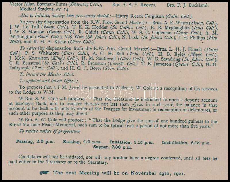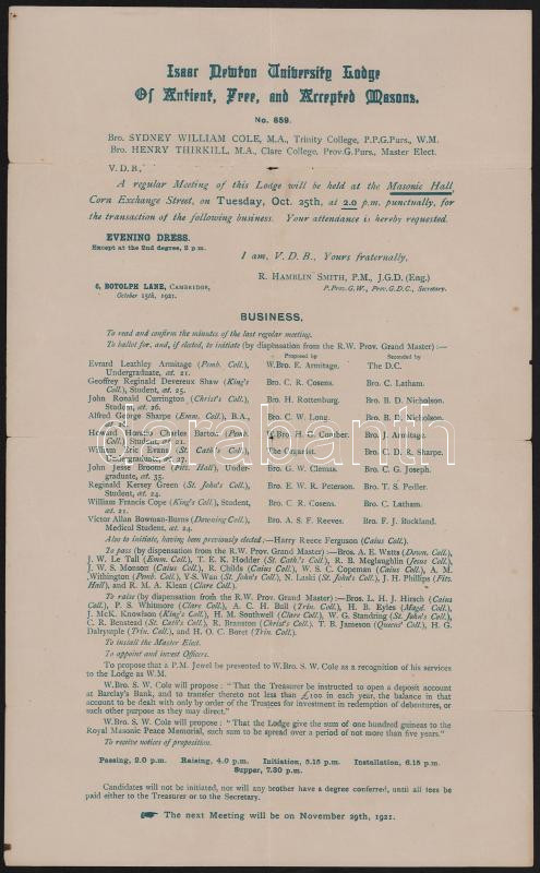 1921 Az Isaac Newton páholy meghívója és tisztségviselői 23x36 cm