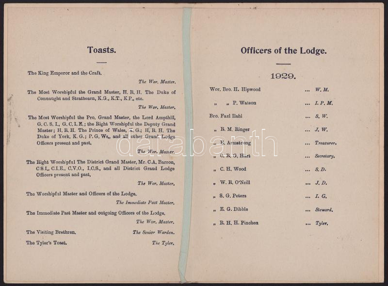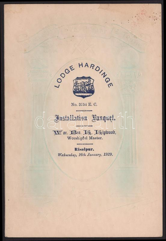 1929 Risalpur (Pakisztán) A Hardinge Páholy bankettjének menükártyája. Dombornyomott emblémás borító. (4)p.