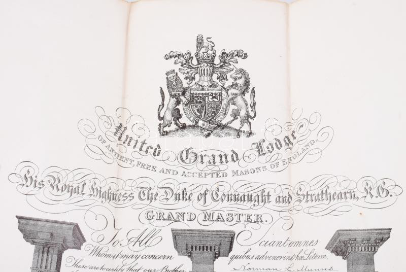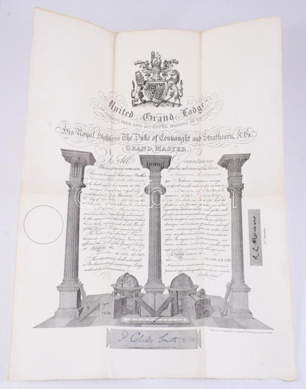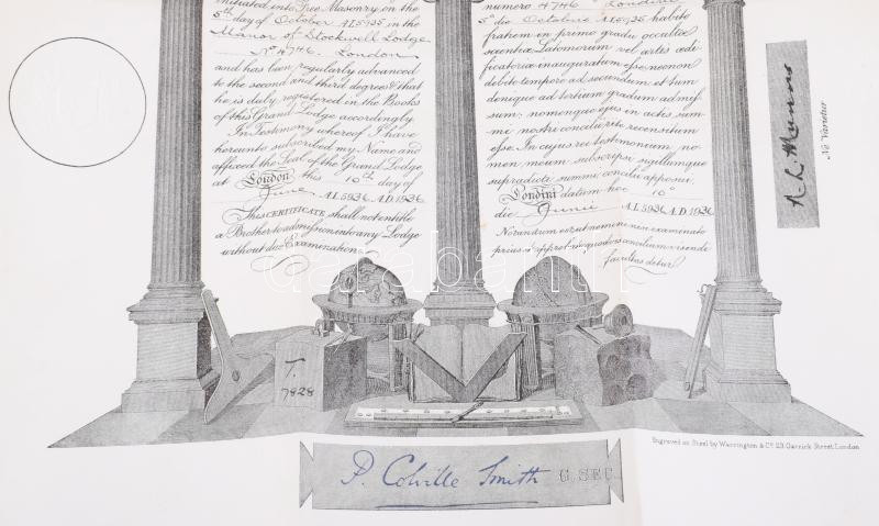 1936 Szabadkőművessé avatási bizonyítvány. a londoni Manor of Stockwell páholyba. Acélmetszet. 30x40 cm Szárzazbélyegzővel 1936 Certificate of initiation into Freemasonry. to the Manor of Stockwell lodge in London. Steel engraving. 30x40 cm With dry seal