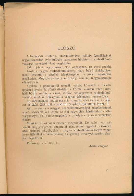 Arató Frigyes: A szabadkőművesség. Bp., 1913, Pátria-ny., 163+[1] p. Második, bővített kiadás. Kiadói papírkötés, sérült borítóval és gerinccel, az első 24 lap kijár.