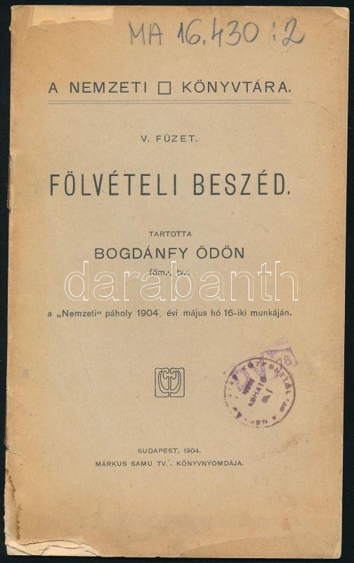 Bogdánfy Ödön: Fölvételi beszéd. Tartotta - - a ,,Nemzeti" páholy 1904. évi május hó 16-iki munkáján. A Nemzeti Páholy könyvtára V. füzet. Bp., 1904, Márkus Samu-ny., 16 p. Kiadói tűzött papÃrkötés, sérült borÃtóval, intézményi bélyegzÅ‘vel, kis foltokkal. (Ritka!)