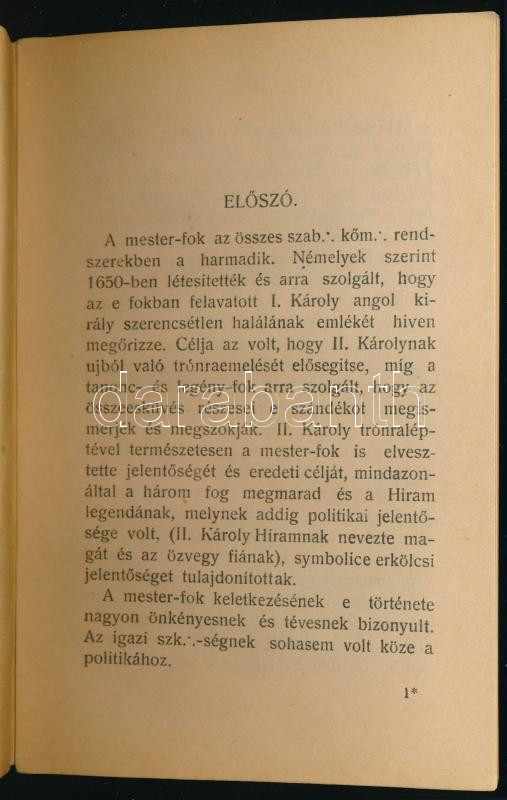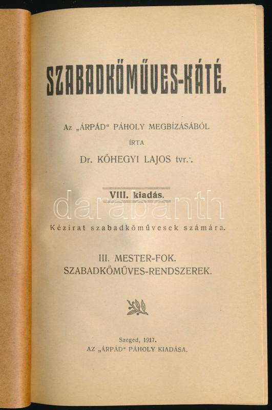 Kőhegyi Lajos: Szabadkőműves-káté. III. Mester-fok. Szabadkőműves-rendszerek. Kézirat szabadkőművesek számára. Az ,,Árpád" páholy megbízásából írta - - . Szeged, 1917, Árpád Páholy (Várnay L.-ny.), 44 p. Kiadói papírkötés, kissé sérült gerinccel.