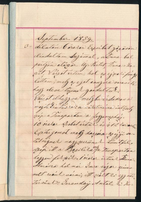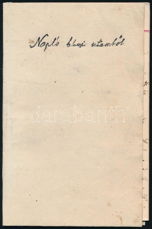 1859 Napló bécsi utamból. Egy lány utazása anyjával Budapestről Bécsbe, először az Erzsébet gőzösön, utána kocsival, majd vasúttal, megemlítve útközbeni élményeit, részletesebben győri tartózkodásról ír, kézirat, 11 beírt oldal, szép állapotban.