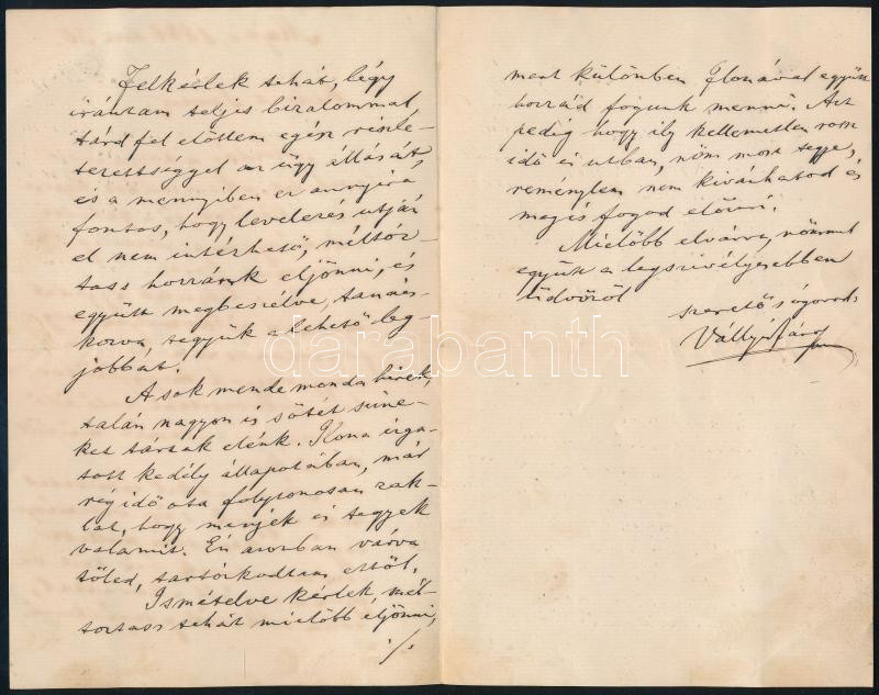 Nagykéri Vállyi János (1826 nov. 24-. 1896 aug. 3.) országos képviselő és a szatmári református egyházmegye segédgondnokánal levele egy bizonyos Sándornak. Vállyi a szabadságharc alatt nemzetőrszázados az erdélyi hadjáratban.
