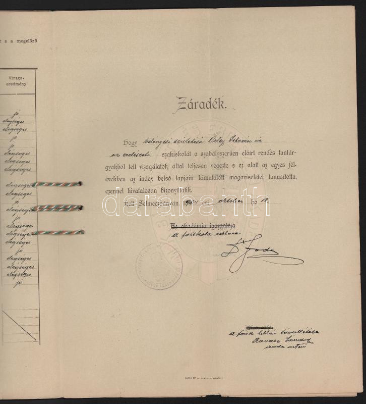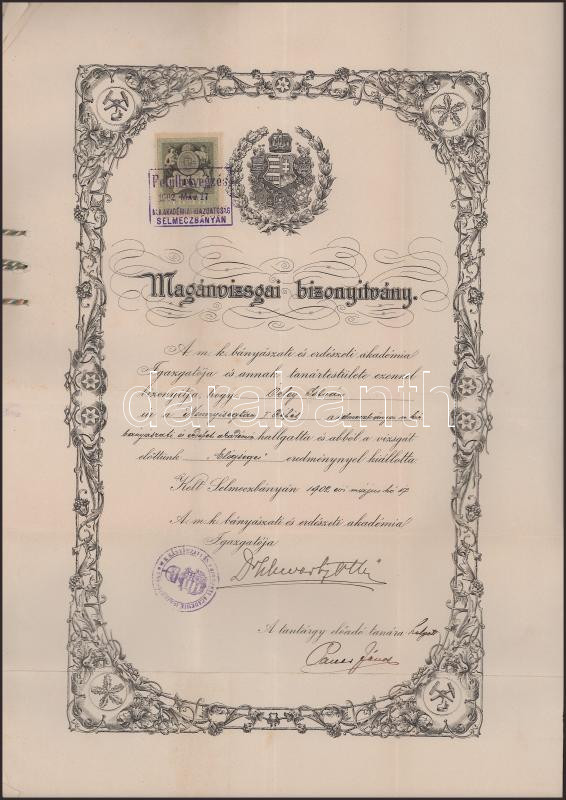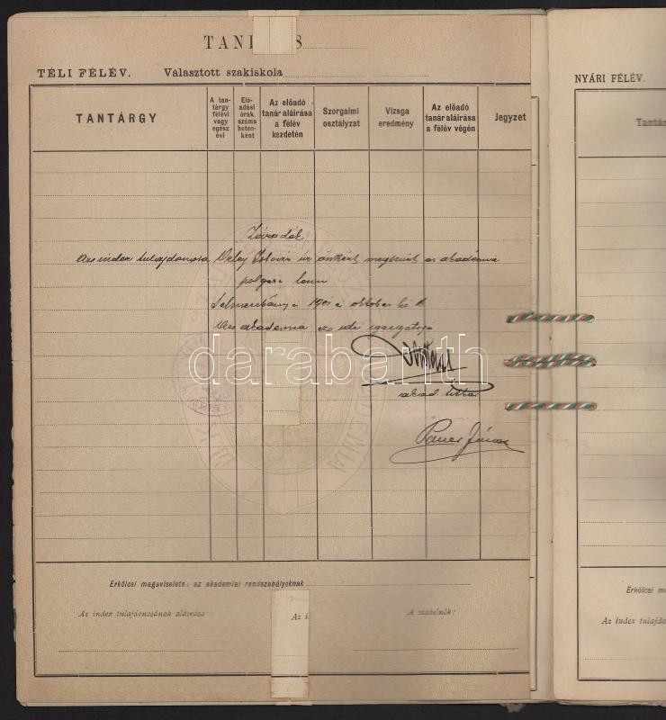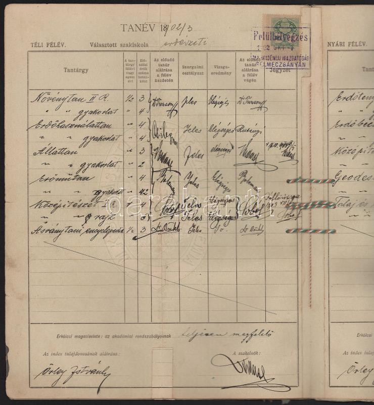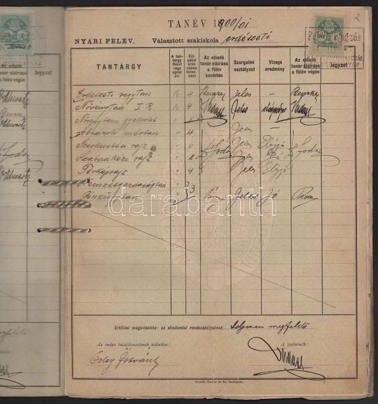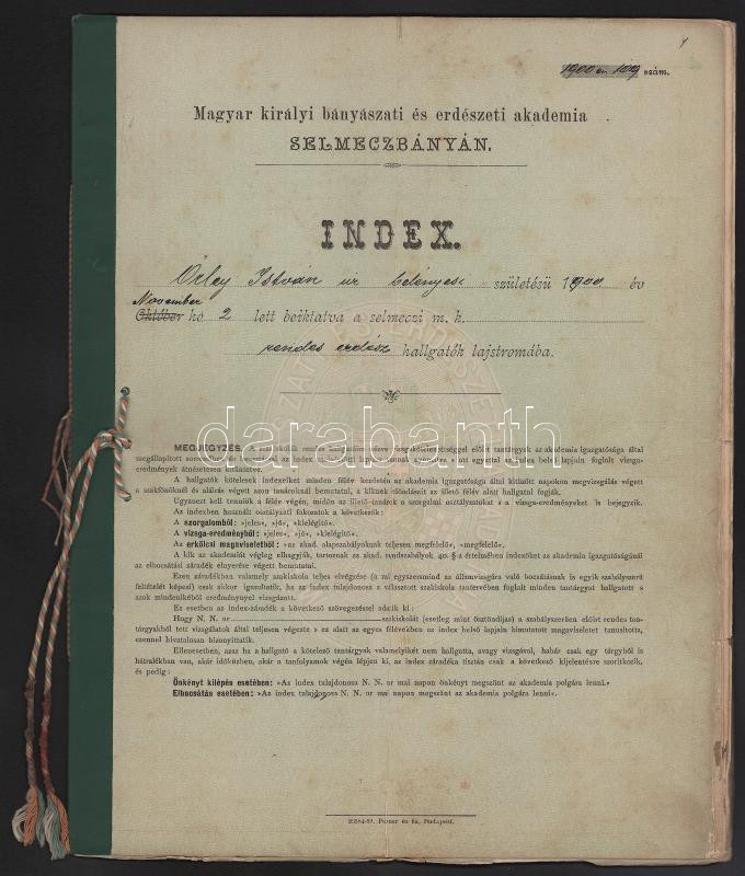 1900-1904 Selmecbánya, M. Kir. Bányászati és Erdészeti Akadémia indexe, Örley István (1882-?) belényesi születésű erdész-hallgató részére, az iskola tanárainak aláírásaival, okmánybélyegekkel, 5 db magánvizsgálati bizonyítvánnyal, kis sérülésekkel, hajtásnyommal, 8 sztl. lev. + 5 sztl. lev.