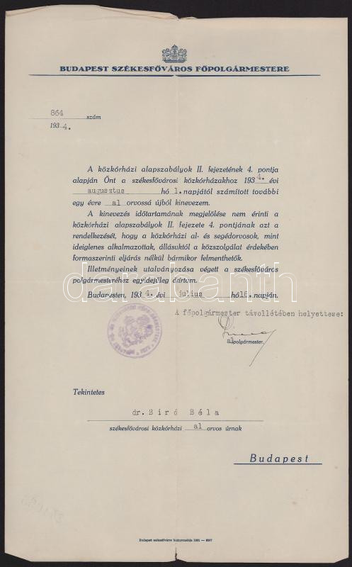 1934 Bp., Liber Endre (1930-1934) budapesti alpolgármester autográf aláírása [Ripka Ferenc főpolgármester helyett] dr. Bíró Béla orvos alorvosi kinevezésén, fejléces papíron, pecséttel.