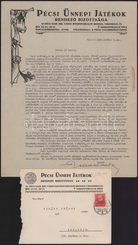 1937 Érdekes levelezés a Szegedi- és Pécsi Szabadtéri Játékokkal kapcsolatban. Janovics Jenő (1872-1945) a szegedi szabadtéri játékok művészeti vezetője, színész, rendező, színigazgató, forgatókönyvíró. aláírt levele Ujházy György (1895-1971) író, újságíró. forgatókönyvírónak amelyben a Missa solemnis c. előadás Pécsre vitele ügyében ír bosszúsan, írói hanyagságnak tartva a válasz elmaradását, Ujházy a valószínűleg szintén sürgető levelet írt Dr. Kelemen Andor (1891-1967) pécsi egyházmegyei pap, teológus és levéltárosnak, aki a Pécsi Szabadtéri Játékok rendezőjének, akinek válaszát olvashatjuk, melyben a játékok programjáról eseményekről írt. Mindkét levél fejléces papírokon, borítékkal.
