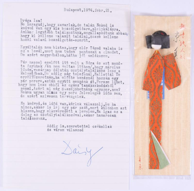 1974-1977 Kiss Daisy (1955-2012) ügyvéd, jogász gépelt, de fel nem adott levele barátnője részére, autográf aláírásával, borítékkal. Valamint ajándék origami gésa, amit neki küldtek japánból.
