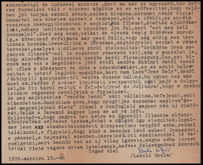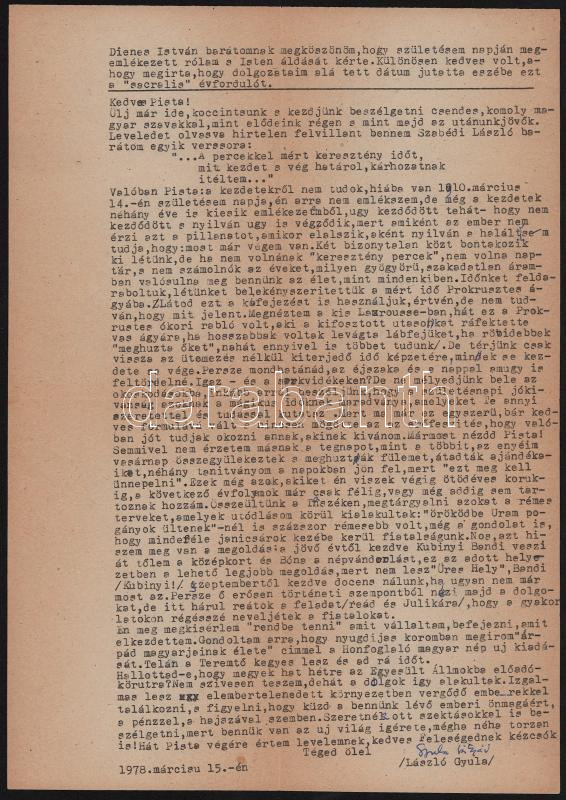 1978 László Gyula (1910-1998) régész-történész gépelt levele Dienes István (1929-1995) régész, muzeológus részére, benne köszönő soraival a születésnapi köszöntésért, valamint benne utódlása körüli dolgokkal is, valamint terveivel nyugdíjas éveire, 1978. márc. 15., autográf aláírásával (Gyula bátyád), borítékkal, 1 gépelt oldal, 1 sztl. lev.
