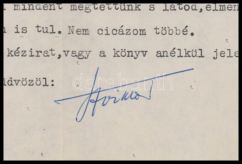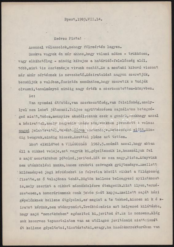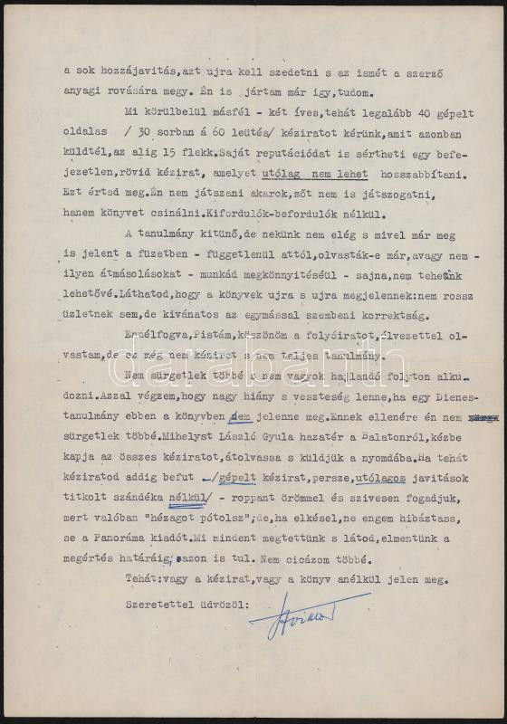 1983 Szombathy Viktor (1902-1987) író, műfordító, a komáromi múzeum egykori igazgatójának (1936-1940) gépelt levele Dienes István (1929-1995) régész, muzeológus részére, melyben sürgeti, hogy küldje meg a kért tanulmányt, és tartsa be a határidőt, aláhúzásokkal, két helyen javítással, autográf aláírással, eredeti borítékkal, 2 gépelt oldal, 1 sztl. lev.