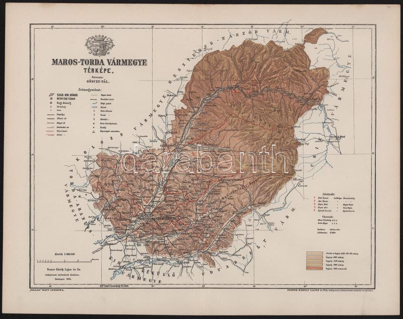 1895 Maros-Torda vármegye térképe, tervezte: Gönczy Pál, Bp., Posner Károly Lajos és Fia, a Pallas Nagy Lexikona melléklete, 24x30,5 cm