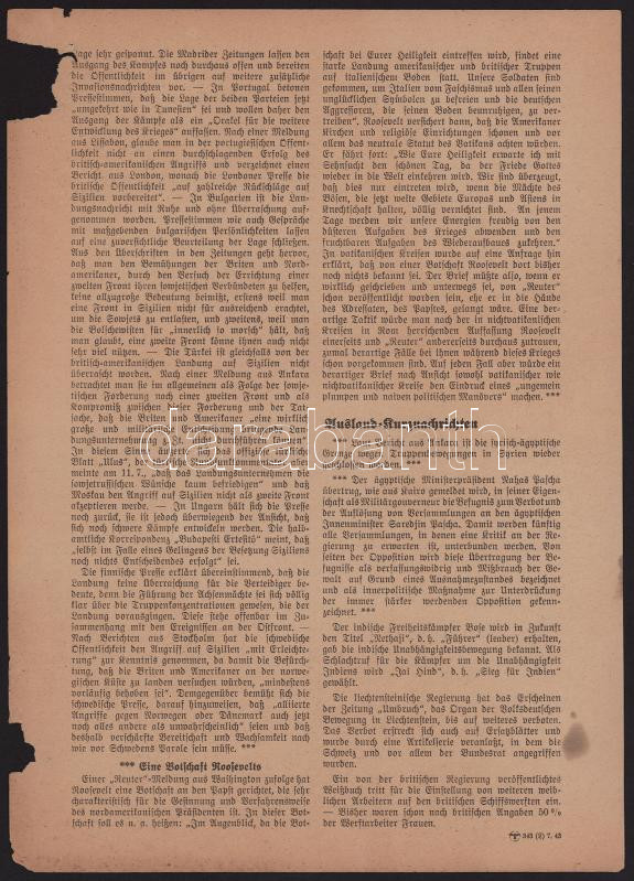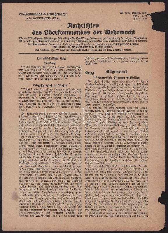 1943 Nachrichten des Oberkommandos der Wehrmacht Nr. 888, a Wehrmacht főparancsnokságának hírei, német nyelven, sérülésekkel, kisebb folttal, 2 p.