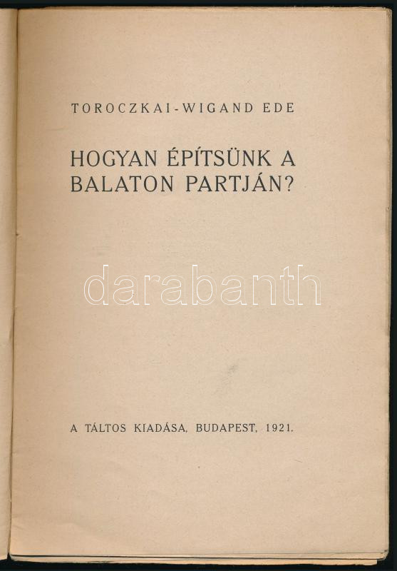 Toroczkai-Wigand Ede: Hogyan építsünk a Balaton partján? Budapest, 1921, Táltos (Hornyánszky Viktor), 38 p. + [2] p., Kiadói papírborítóval. A borító elvált a könyvtesttől, lapok jó állapotban