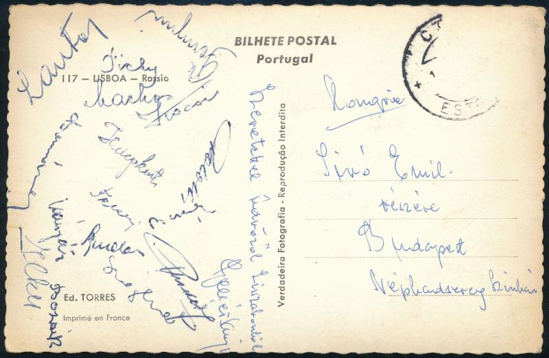 1956 Postcard signed by the players of the Golden Team from Lisbon about the match against Postugália (2:2) (Sándor Kocsis, Nándor Hidegkuti, Sándor Gellér, József Bozsik, Gyula Grosics, Mihály Lantos, Zoltán Czibor, Jenő Buzánszky, Ferenc Puskás, etc.)
